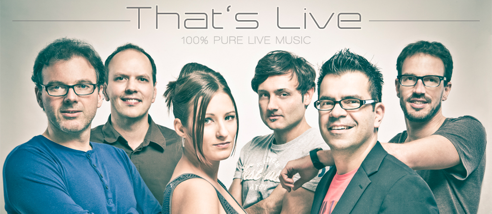 Herzlich Willkommen auf der Webseite der Band That's Live 100% pure live music! Wir sind die richtige Wahl, wenn Sie Wert auf exzellente und individuelle Livemusik legen. Ob Hochzeit, Firmenevent oder Ballnacht, wir bieten Ihnen eine erstlkassige musikalische Umrahmung für Ihre Veranstraltung. Mit unserem umfangreichen Programm begleiten wir Sie stilvoll durch den Abend und bringen Ihre Party richtig in Schwung. Sektempfang und Dinner begleiten wir mit dezentem Jazz und Loungemusic (auf Wunsch auch in reduzierter Besetzung), unser Tanzrepertoire lockt alle Generationen auf die Tanzfläche und mit unseren Partyhits geht später dann so richtig die Post ab! Vier hervorragende Musiker aus München und Augsburg erschaffen die Grundlage für Sängerin und Sänger, die sich auf der Bühne wunderbar ergänzen und ihr Publikum mitreißen. Überzeugen Sie sich selbst und genießen Sie unser Video und unsere Hörproben. Wir freuen uns darauf, auch Ihre Veranstaltung mit unserer Musik zu veredeln.